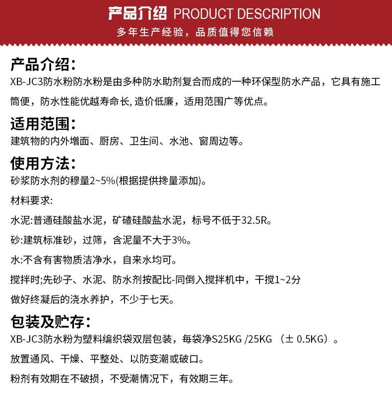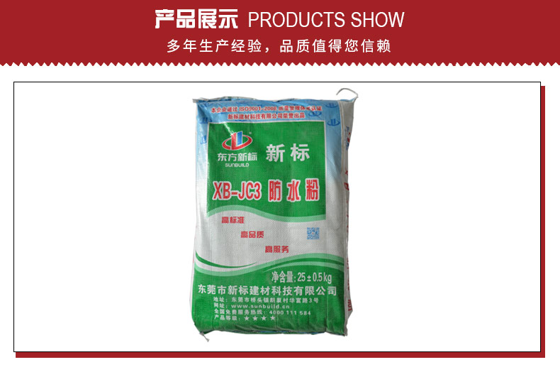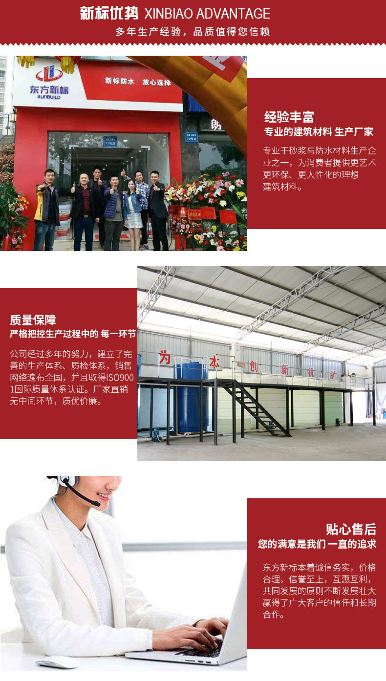 产品详情 ![]() ![]() ![]() 东莞市新标实业发展有限公司是广东省专业干砂浆与防水材料生产企业之一。公司在建材行业中独树一帜,引领当今社会对建筑材料前沿的消费观念,为消费者提供更艺术、更环保、更人性化的理想建筑材料。 东莞市新标实业发展有限公司占地15000平方米,建筑面积达6000多个平方。公司经验丰富,配备完善,拥有十多年的化工建材生产经验,完善的质量监控中心与检测设备,集科研、生产、销售服务为一体。公司现有技术部工程师5名,技术人员10余人,可以随时为用户提供技术咨询和相关服务。对于重大工程,公司可在施工单位设立办事处,指派专业人员协助圆满完成工程任务。公司全面推行ISO国际质量管理体系认证标准化管理,严格按照ISO9001:2008质量体系标准对所有产品进行程序化管理,对每道生产工序进行严格地检测和控制,确保生产出的产品质量优良,符合国家相应标准。公司凭借先进的环保建筑材料和创新技术,产品成功应用于房屋建筑、水利设施、高速公路、铁路、城市道桥、地铁、轨道、机场等众多领域,效果优良,获得了行业及广大客户的认可与好评。 公司坚持“高标准、高品质、高服务”的宗旨,竭诚为用户提供优质的产品和良好的售后服务;倡导“以人为本,构筑和谐”的企业文化,立足长远,不断广泛吸收中外先进企业管理经验,积极改善法人治理与产业结构,优化产权制度,完善内部激励机制和市场营销机制,实现公司的可持续发展。 公司将一如既往与各界新老朋友一道,精诚合作,共创辉煌。 |