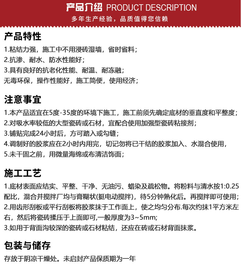 产品详情 ![]() ![]() ![]() ![]() ![]() 东莞市新标实业发展有限公司是广东省专业干砂浆与防水材料生产企业之一。公司在建材行业中独树一帜,引领当今社会对建筑材料前沿的消费观念,为消费者提供更艺术、更环保、更人性化的理想建筑材料。 东莞市新标实业发展有限公司占地15000平方米,建筑面积达6000多个平方。公司经验丰富,配备完善,拥有十多年的化工建材生产经验,完善的质量监控中心与检测设备,集科研、生产、销售服务为一体。公司现有技术部工程师5名,技术人员10余人,可以随时为用户提供技术咨询和相关服务。对于重大工程,公司可在施工单位设立办事处,指派专业人员协助圆满完成工程任务。公司全面推行ISO国际质量管理体系认证标准化管理,严格按照ISO9001:2008质量体系标准对所有产品进行程序化管理,对每道生产工序进行严格地检测和控制,确保生产出的产品质量优良,符合国家相应标准。公司凭借先进的环保建筑材料和创新技术,产品成功应用于房屋建筑、水利设施、高速公路、铁路、城市道桥、地铁、轨道、机场等众多领域,效果优良,获得了行业及广大客户的认可与好评。 公司坚持“高标准、高品质、高服务”的宗旨,竭诚为用户提供优质的产品和良好的售后服务;倡导“以人为本,构筑和谐”的企业文化,立足长远,不断广泛吸收中外先进企业管理经验,积极改善法人治理与产业结构,优化产权制度,完善内部激励机制和市场营销机制,实现公司的可持续发展。 公司将一如既往与各界新老朋友一道,精诚合作,共创辉煌。 |